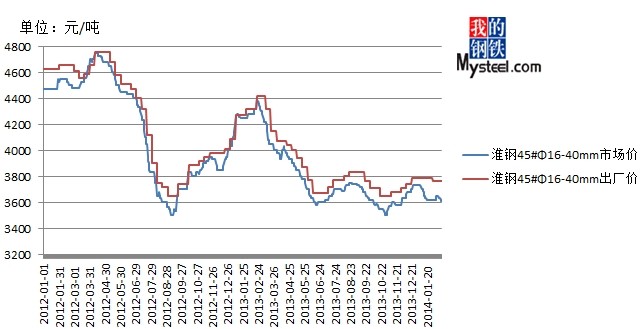 圖2:淮鋼45#Φ16-40mm出廠價、市場價走勢比對