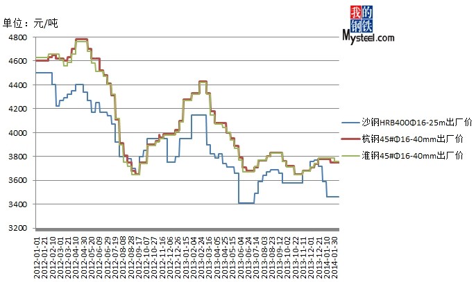 圖3:沙鋼HRB400Φ16-25、杭鋼45#Φ16-40、淮鋼45#Φ16-40出廠價比對圖