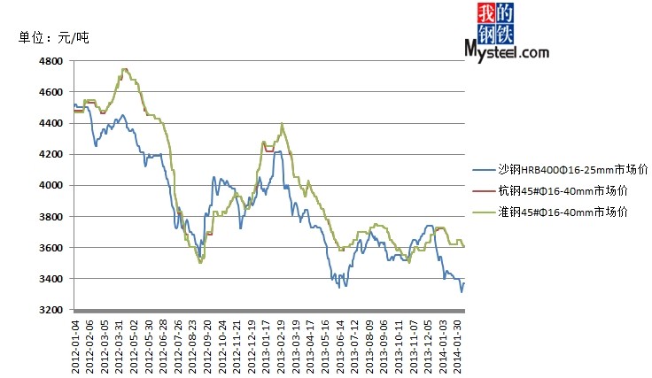 圖4:沙鋼HRB400Φ16-25、杭鋼45#Φ16-40、淮鋼45#Φ16-40市場價比對圖